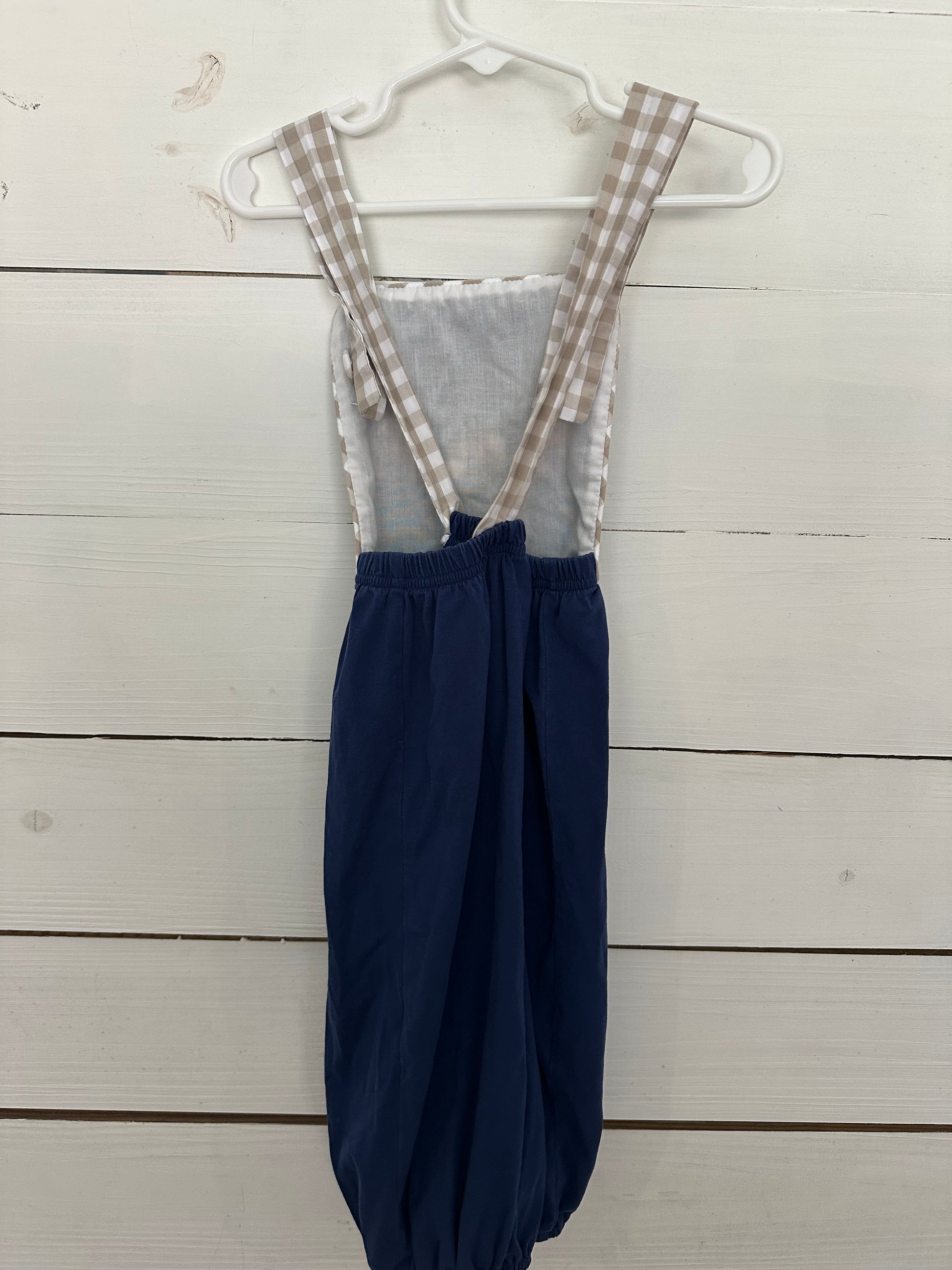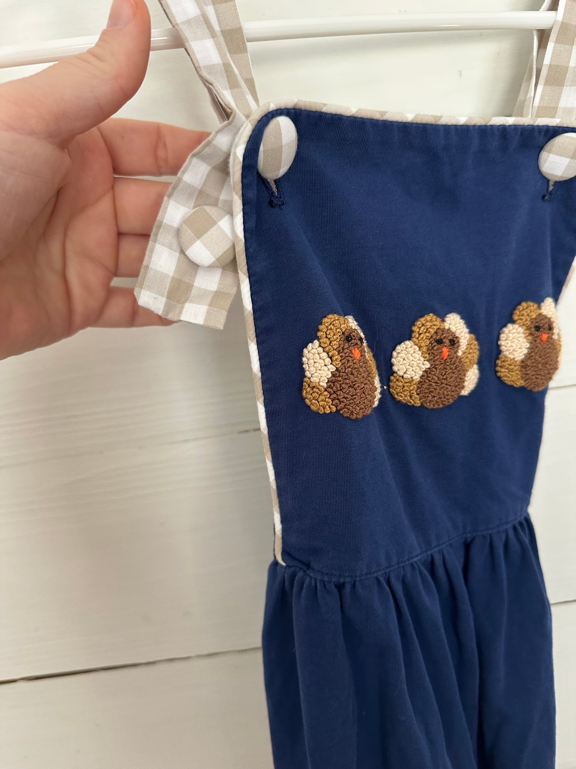 24M - Sugar Dumplin - Navy Blue French Knot Turkey Overalls with Adjustable Gingham Staps - Cotton