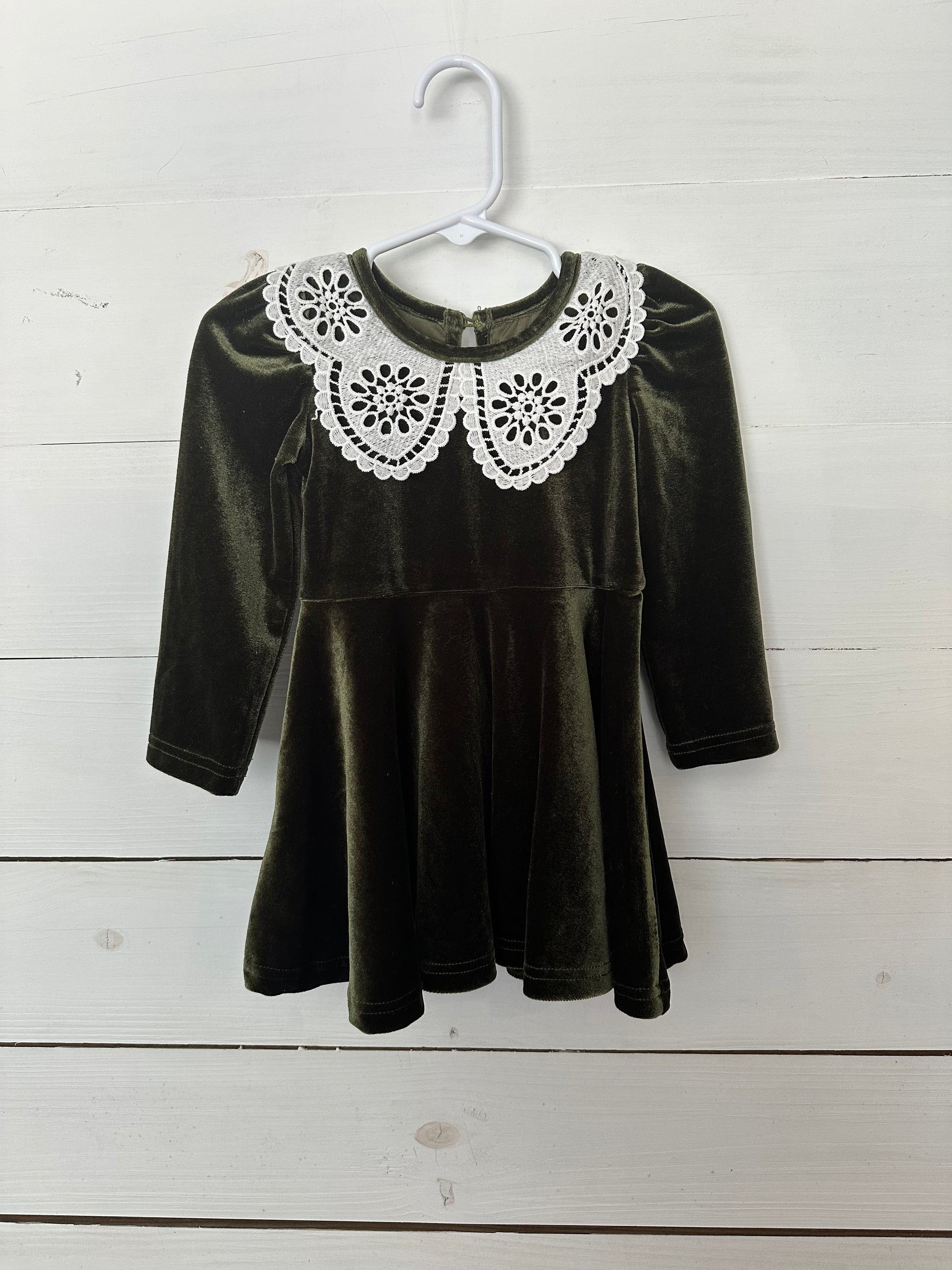 Smocked Sweet Green Velvet Dress with Lace Collar